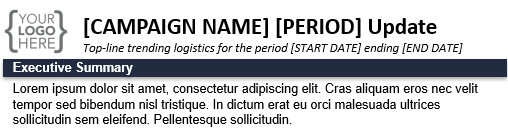 The executive summary should be a concise, two to three-sentence overview highlighting key accomplishments from the previous period, the target audience reached, and overall progress trends.