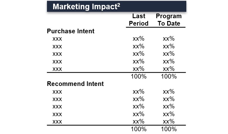 Market Impact measures how effectively marketing creates intent where it didn’t previously exist. Purchase Intent and Recommendation Intent are measured to compare and contrast two variants on impact.