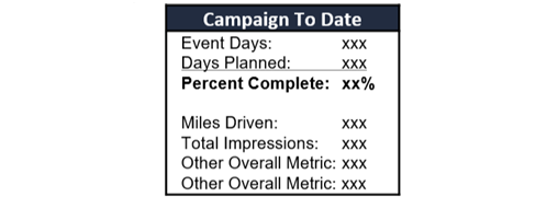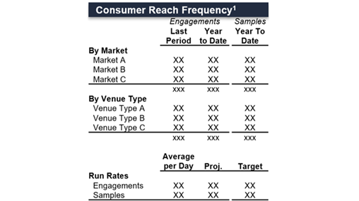 Use this space to report on the number of event days, markets visited, or marque events. Trends around marketing reach (e.g., engagement rates, sample distribution, etc.) may also be considered.